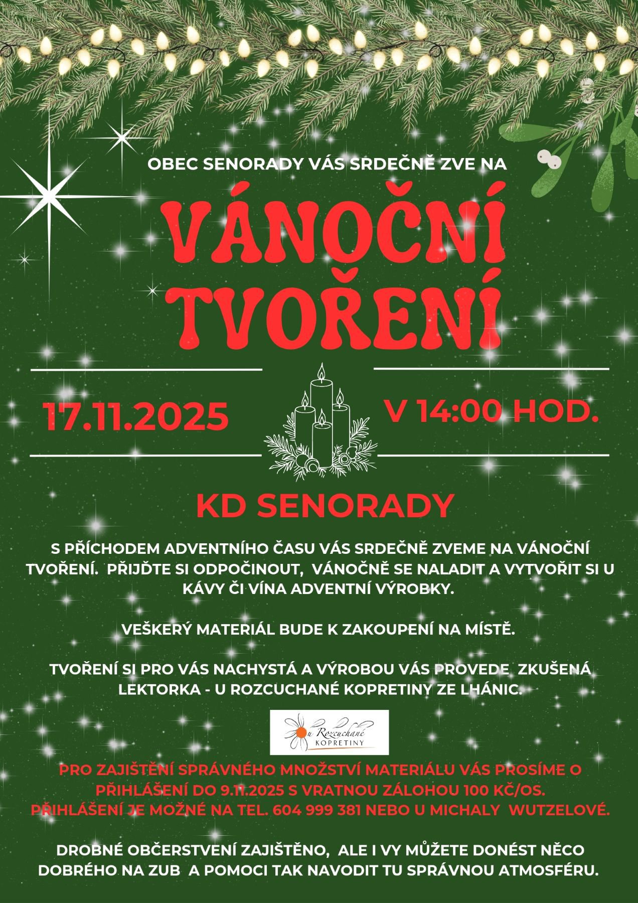 Srdečně zveme všechny příznivce vánočního tvoření na odpolední dílničku s možností výroby vlastních adventních dekorací. Akce se uskuteční v pondělí 17.11.2025 od 14:00 hodin v kulturním domě v Senoradech.