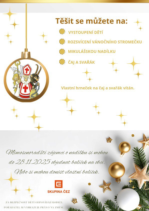 Srdečně zveme všechny děti, rodiče, prarodiče a příznivce adventního koledování na Adventní podvečer a Mikulášskou nadílku, která se uskuteční v sobotu 6.12.2025 od 16:00 hodin v parku u hasičské zbrojnice. Můžete se těšit na vystoupení dětí, návštěvu Mikulášské družiny, rozsvícení stromečku, nový betlém a chutné občerstvení. Těšíme se na vás