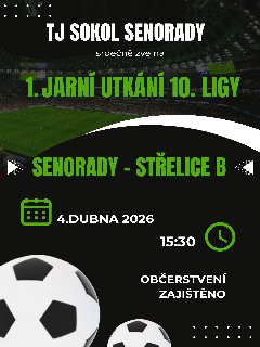 TJ Sokol Senorady srdečně zve všechny fotbalové příznivce na 1. jarní utkání 10. ligy, které se uskuteční v sobotu 4. dubna od 15:30 hodin. Občerstvení zajištěno.