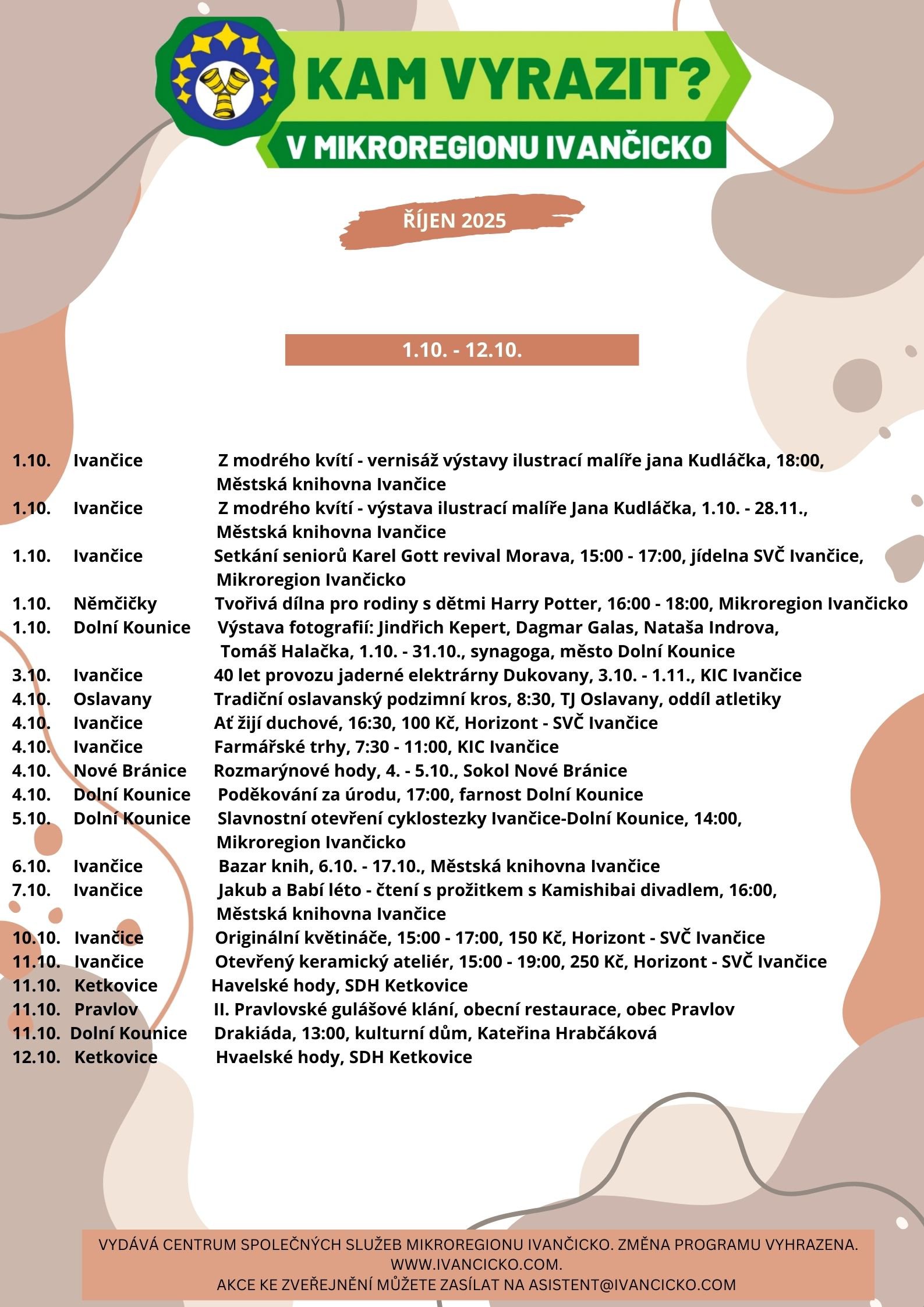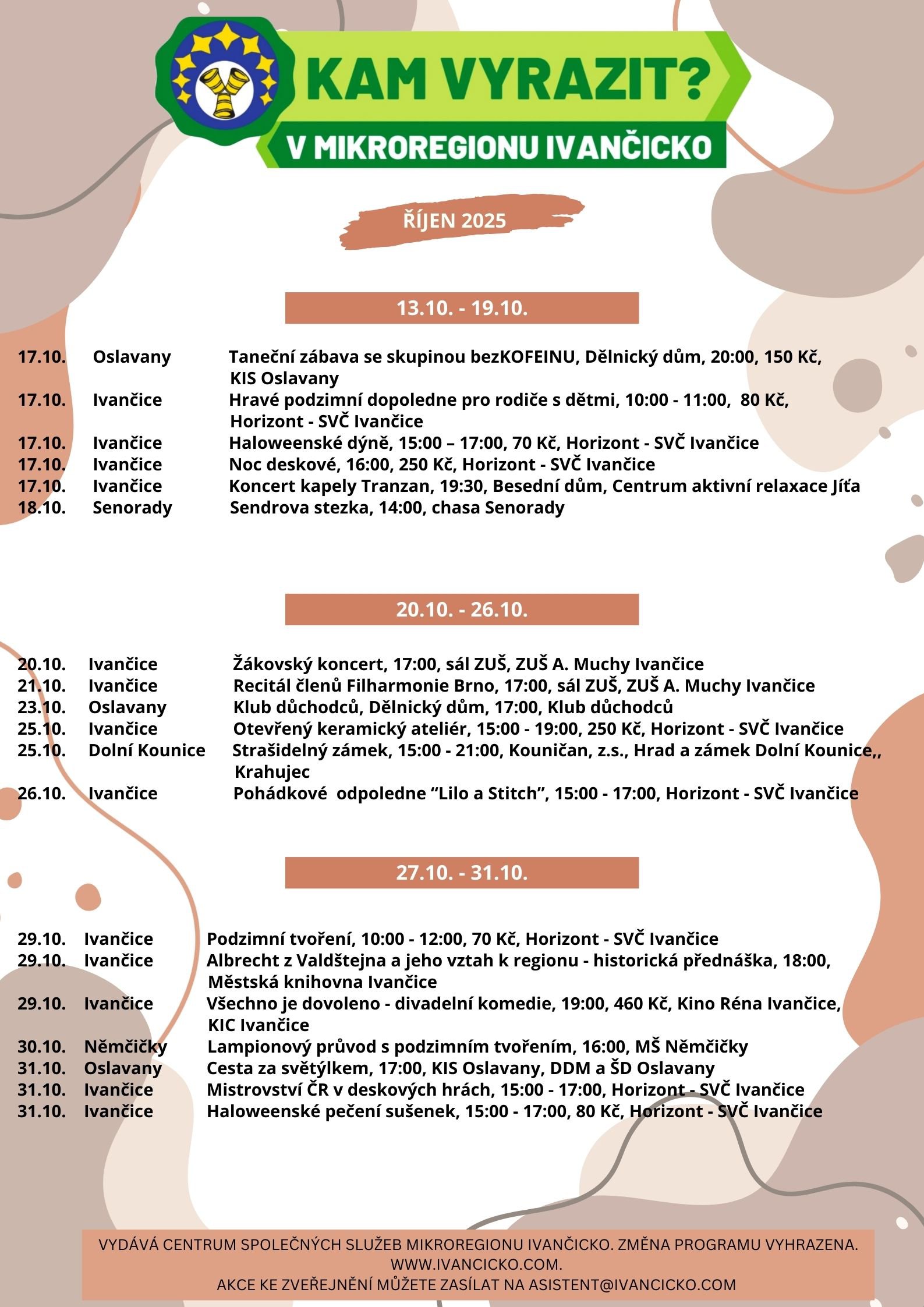 V přílohách zveřejňujeme seznam akcí, které se budou konat v MR Ivančicko v měsíci říjnu.