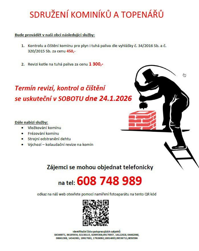 Sdružení kominíků a topenářů bude provádět v naší obci v SOBOTU dne 24.1.